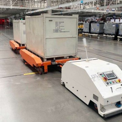 尾部牽引型AGV滿足多種物料配送,具備自動后退對接功能。