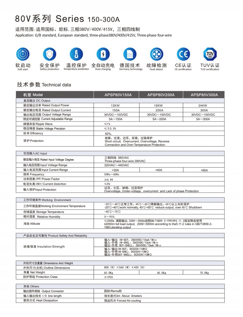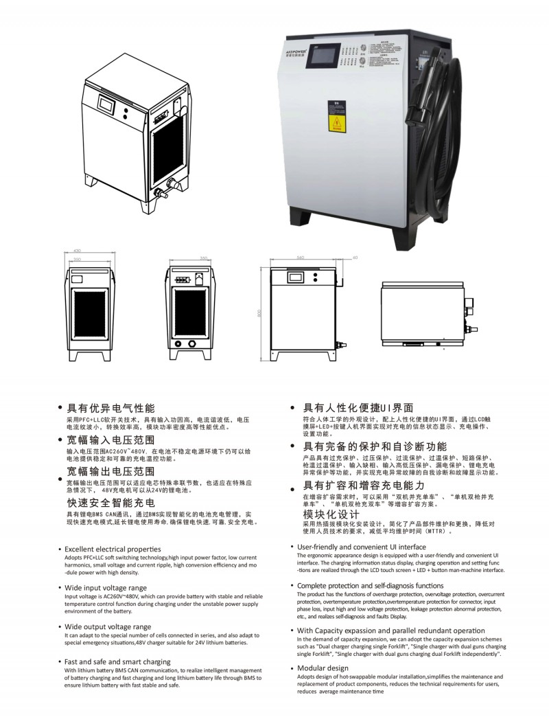 觸摸屏智能操作設(shè)計:告別傳統(tǒng)按鍵方式,給您帶來更現(xiàn)代更具科技智能的操作體驗 自動充電:插槍自動充電,簡化充電流程,便于操作 兼容性高:80V200A兼容48V200A充電 多重保護: 輸出短路,過流過壓保護,反接保護,電流導管保護等多重保護 預約充電功能:避開高峰用電時段,有效節(jié)省成本 雙語切換:中英文雙語隨需切換,跨越語言障礙,與世界接軌 人性化設(shè)計:充電機背板內(nèi)部附部件明細及產(chǎn)品接線圖,方便客戶可更清楚的了解產(chǎn)品,便于維修,提高售后時效 獨特設(shè)計: 內(nèi)置電磁鎖驅(qū)動模塊,防止臨時斷電鎖槍 使用壽命更長:功率模塊預留20%空間,提高模塊的使用壽命 出色內(nèi)部結(jié)構(gòu): 內(nèi)部結(jié)構(gòu)左右出風,內(nèi)部電路不容易積粉塵,提高充電機壽命