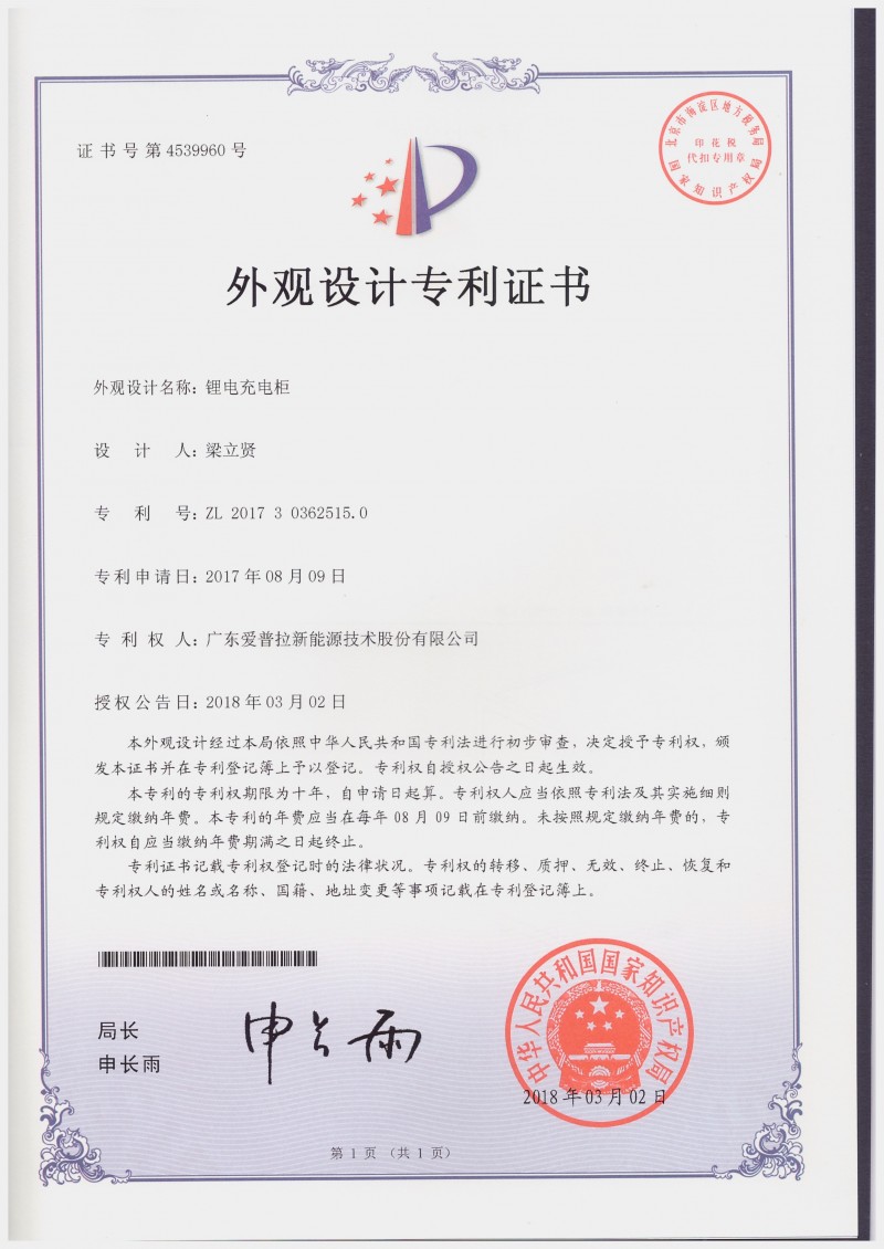 發證機構:   中國人民共和國知識產權局局 發證時間 :   2017-08-09