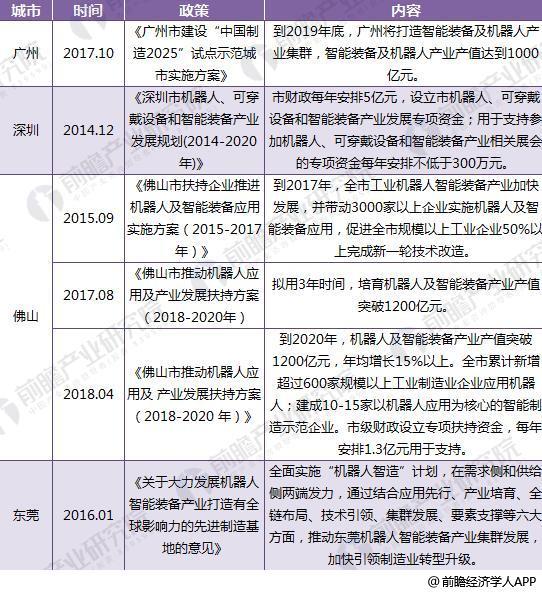 截至2018年,有14個(gè)地級(jí)市出臺(tái)機(jī)器人產(chǎn)業(yè)發(fā)展和加大科研投入建立智能型機(jī)器人研發(fā)機(jī)構(gòu)的相關(guān)政策和獎(jiǎng)勵(lì)機(jī)制,包括廣州、佛山、東莞、嘉興、泉州、長(zhǎng)沙等。