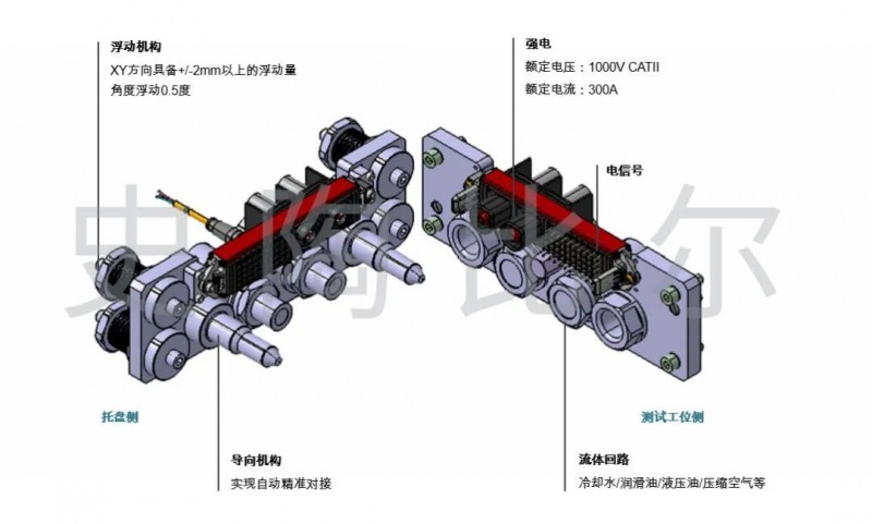 然而,由于在自動(dòng)測(cè)試線上,采用單回路分別連接極其低效且易出錯(cuò),與自動(dòng)測(cè)試快節(jié)奏和低容錯(cuò)的要求不能完美適配,因此能將多回路(包括水、油、氣、電)一次性集中連接的組合連接器也就成為了自動(dòng)測(cè)試線上的剛需產(chǎn)品——即將電驅(qū)動(dòng)上的強(qiáng)電、信號(hào)、冷卻液、潤(rùn)滑油等回路集中連接至“托盤快速連接器”,“托盤快速連接器”與各測(cè)試工位側(cè)的“臺(tái)架連接器”自動(dòng)對(duì)接,保障回轉(zhuǎn)式自動(dòng)測(cè)試線體順利運(yùn)行。