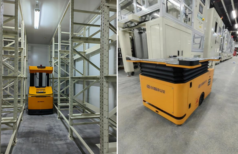 助力客戶實現(xiàn)了車間物料無人化運輸及自動上下料,有效減少了人工,進一步提升了生產(chǎn)效率。三、創(chuàng)智科技-數(shù)碼電池后工序智能物流項目本次項目范圍為注液后到包裝出電芯成品的數(shù)個工序,通過專用AGV完成工序間接駁;側叉式AGV完成高溫房、常溫房自動出入庫和智能化倉儲管理。其中,高溫房常年維持在50℃高溫環(huán)境中,傳統(tǒng)的人工搬運出,作業(yè)員需穿戴防護服,工作不便效率低下,且勞動強度高,由此,即影響生產(chǎn)效率,同時人員流失率高。創(chuàng)智科技通過創(chuàng)新研發(fā),開發(fā)出了高溫房專用側叉式AGV,其使用物流通道小,使用庫容高;結合WMS倉庫管理系統(tǒng),實現(xiàn)了高溫靜置工序無人化、信息化。