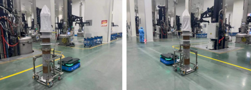 本次項目,用戶通過引入迦智科技涵蓋數十臺迦智全向AMR車隊和機器人調度管理系統CLOUDIA、物料管理系統MCS等在內的整套智造物流解決方案,實現了1700度高溫的硅原料(毛棒)從2F拉晶爐到1F切斷機的自動轉運和暫存、上下料作業。