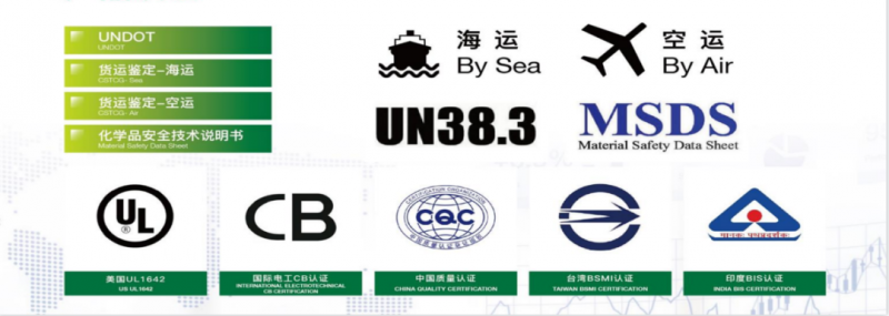 電池因其本身材質構造原因,在使用當中對穩定性、安全性有著極高要求?;诖?,領域科技深入技術研發,把控每一個產品細節,使其達到國際水準,公司已通過ISO9001、ISO14001、ISO45001、ITAF16949體系認證,產品均符合國際運輸UN38.3認證、歐盟CE認證、北美UL認證及德國萊茵TUV認證要求,具備國際競爭力。