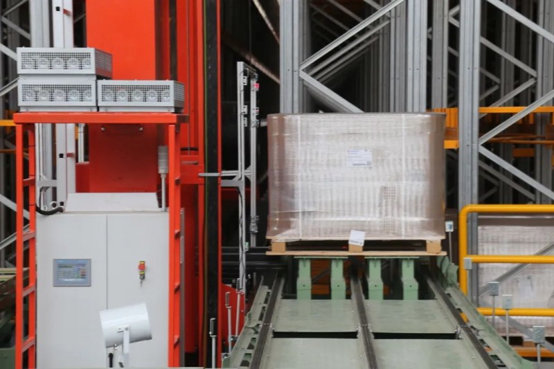 存儲貨架區(qū)配備了18臺雙立柱堆垛機,其負載可達1650公斤,水平運行速度可達120m/min,垂直速度可達30m/min。輸送至巷道口的托盤就會由堆垛機運送至對應的貨位上完成存儲。