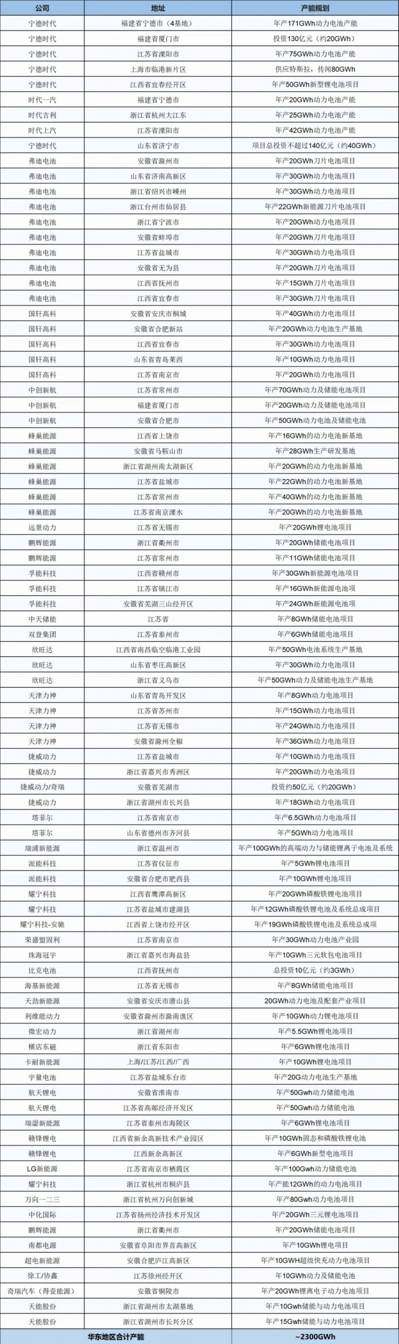 全國動力與儲能電池基地產能統計表1---華東地區