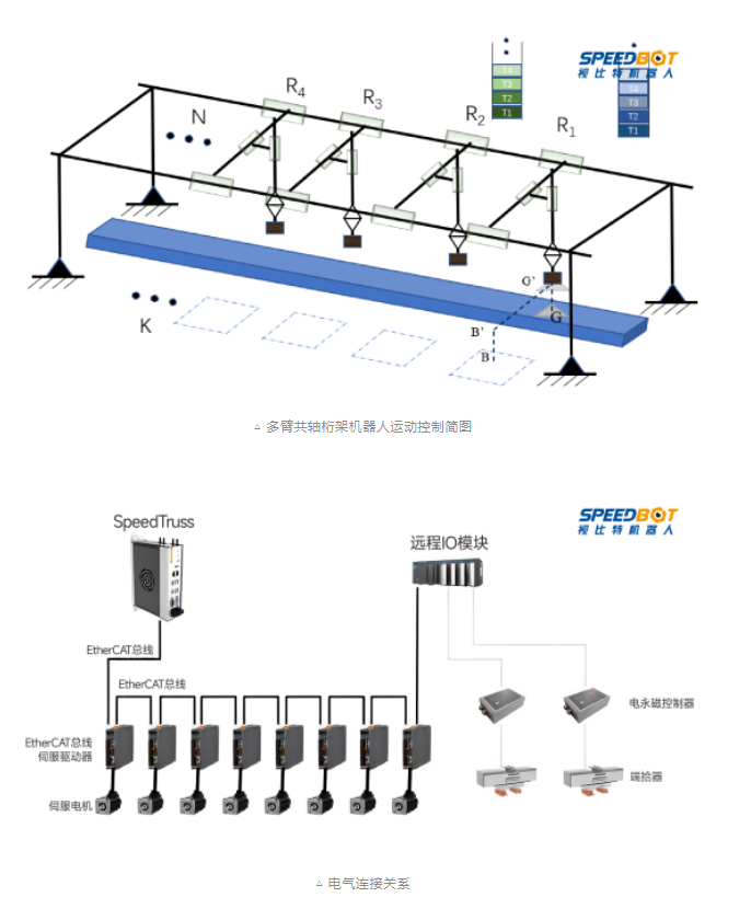 SpeedTruss智能桁架控制器主要用于多臂共軸桁架機(jī)器人(N≥1)的運(yùn)動(dòng)控制,運(yùn)用自主研發(fā)的桁架運(yùn)動(dòng)規(guī)劃、多臂協(xié)同運(yùn)動(dòng)控制、無碰運(yùn)動(dòng)協(xié)調(diào)等算法技術(shù),為智能產(chǎn)線提供靈活、精準(zhǔn)、高效的多臂桁架運(yùn)動(dòng)控制方案。用戶只需調(diào)用控制器提供的高級(jí)任務(wù)指令接口(如將某臺(tái)桁架臂移動(dòng)到目標(biāo)位置K),即可實(shí)現(xiàn)對(duì)桁架機(jī)器人運(yùn)動(dòng)軌跡的自動(dòng)控制與協(xié)調(diào),保障各個(gè)桁架臂高效無碰協(xié)同運(yùn)動(dòng),有效提升生產(chǎn)效率。
