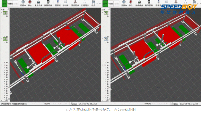 在多任務(wù)場(chǎng)景下,桁架機(jī)器人存在多個(gè)共軸的機(jī)械臂,不同臂在工作空間內(nèi)的任務(wù)時(shí)序直接影響整體作業(yè)效率。SpeedTruss智能桁架控制器建立了基于時(shí)空約束的最優(yōu)任務(wù)分配模型,最大限度地提高工作效率。