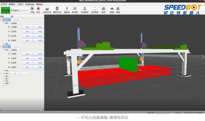 · 可視化場(chǎng)景編輯,用戶可在界面狀態(tài)欄中進(jìn)行障礙物方位的修改、移除或添加,實(shí)現(xiàn)對(duì)桁架機(jī)器人的柔性控制。