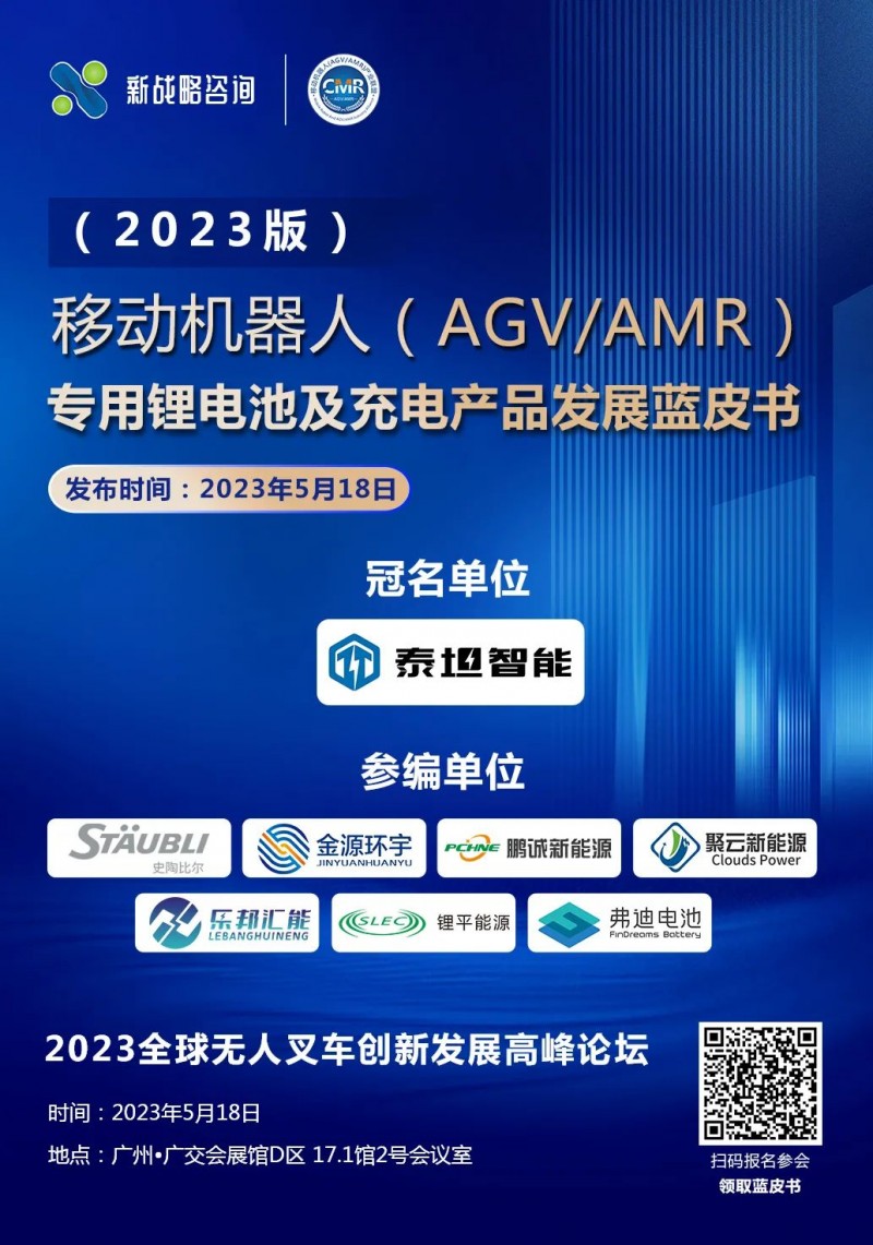 為了更好地解讀當前AGV/AMR市場鋰電池及充電產品相關應用情況及趨勢,5月18日,由CMR產業聯盟及新戰略移動機器人產業研究所主編,廣東泰坦智能動力有限公司冠名發布,史陶比爾(杭州)精密機械電子有限公司、河南金源環宇儲能技術有限公司、深圳市鵬誠新能源科技有限公司、蘇州聚云新能源科技有限公司、樂邦新能源(天津)有限公司、上海鋰平能源科技有限公司、深圳比亞迪鋰電池有限公司/弗迪電池等企業聯合參編的《移動機器人(AGV/AMR)專用鋰電池及充電產品發展藍皮書(2023版)》將在“