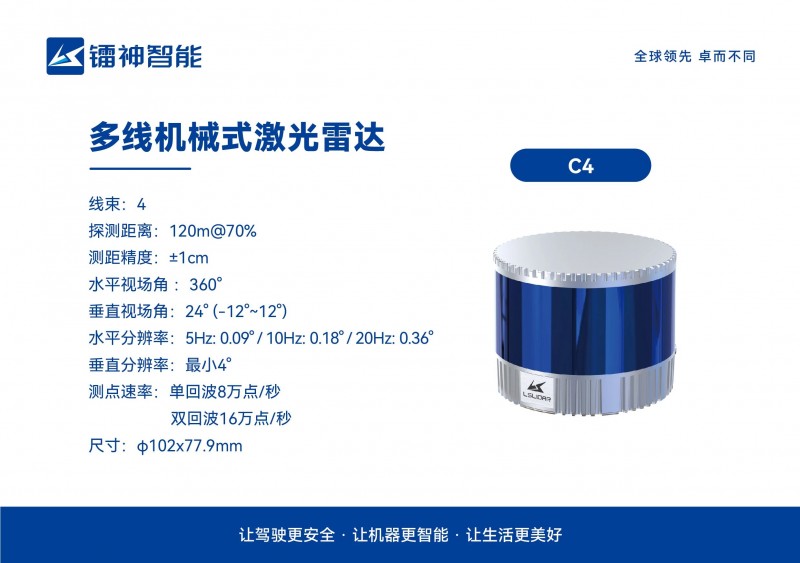 鐳神智能多線機(jī)械式激光雷達(dá)C4、C8和CH16R采用TOF時(shí)間飛行法,實(shí)現(xiàn)對(duì)周圍環(huán)境360°三維高速掃描,探測(cè)距離高達(dá)120m,測(cè)距精度可達(dá)±1cm,不易受外界環(huán)境光影響,產(chǎn)品體積小,具備非常強(qiáng)的應(yīng)用價(jià)值,可廣泛應(yīng)用于無人叉車、服務(wù)機(jī)器人、AGV、無人駕駛、安防、港口等領(lǐng)域,支持建圖、定位、識(shí)別、避障等功能,幫助客戶打開更多市場(chǎng)空間。