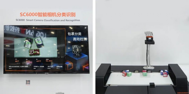 該相機(jī)采用高性能AI嵌入式平臺(tái)開發(fā),內(nèi)置VM算法開發(fā)平臺(tái),多種通訊協(xié)議,場(chǎng)景適應(yīng)能力強(qiáng)。現(xiàn)場(chǎng)展示的是SC6000對(duì)流通行業(yè)快遞包裹進(jìn)行分類識(shí)別,可準(zhǔn)確對(duì)傳送帶上不同類別包裹進(jìn)行準(zhǔn)確定位和類別分類。