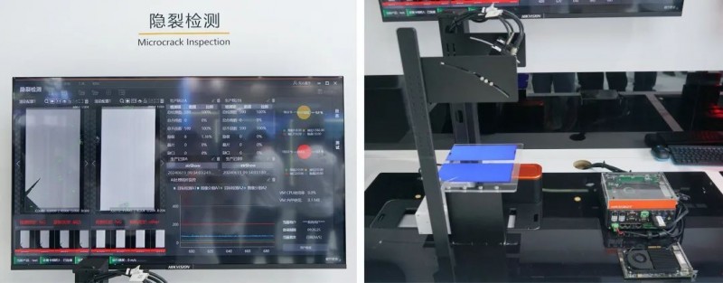 其中,隱裂檢測方案使用“4k黑白線陣相機(jī)+大靶面短波紅外鏡頭+穿透式近紅外線激光光源”,可對(duì)0.5mm以上尺寸的脫晶、崩邊、破片、隱裂以及疊片、臟污進(jìn)行檢出與分類;在數(shù)據(jù)處理上,采用了新發(fā)布的SVA智能視覺處理卡方案,將軟件的大部分傳統(tǒng)算法與深度學(xué)習(xí)檢測模塊轉(zhuǎn)入這張采集卡內(nèi)工作,極大降低了工控機(jī)的硬件資源占用。