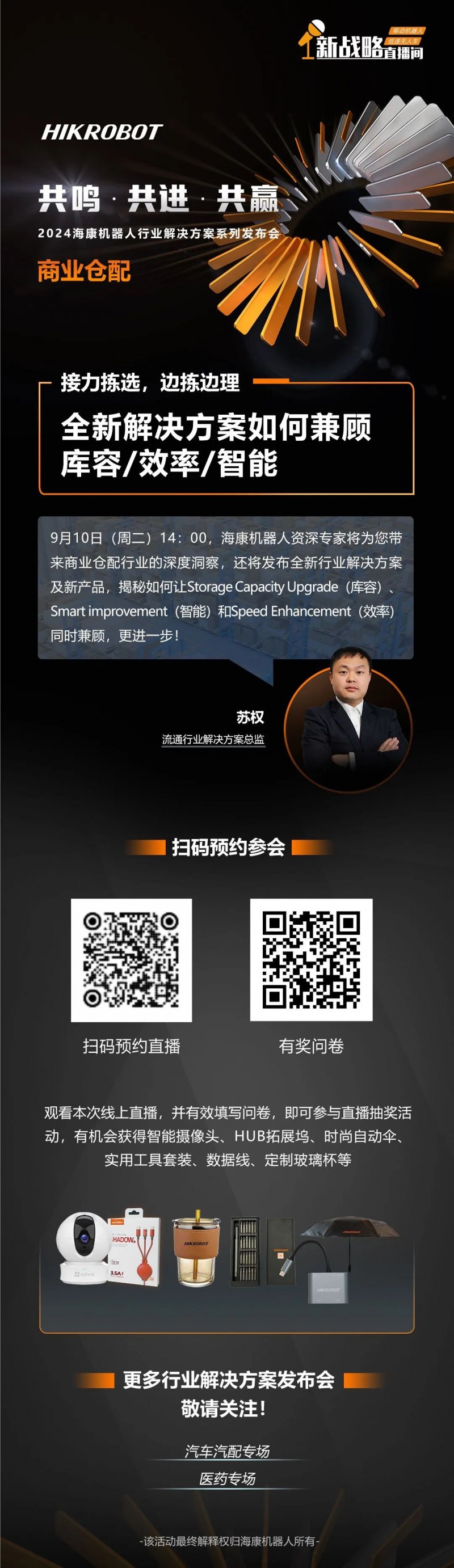 通過本次直播,您將有機會聆聽來自資深專家對行業的深刻見解,了解海康機器人最新解決方案和產品,還有機會贏得實用禮品!