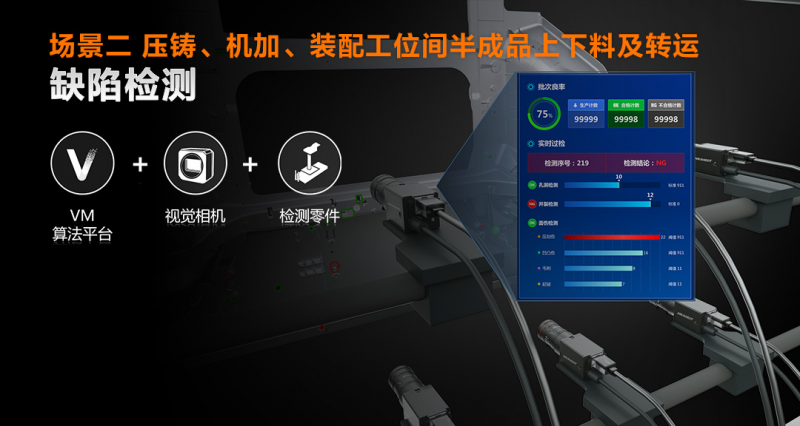 海康機器人利用工業(yè)相機,并通過VM算法平臺,實現(xiàn)高效缺陷檢出。對于壓鑄件,能夠檢測出凸起、缺料、多料、裂紋和碰劃傷等缺陷;在機加和裝配環(huán)節(jié),檢測內容包括孔洞有無、通孔是否打通、螺紋孔質量、預鑄孔加工面和倒角等。