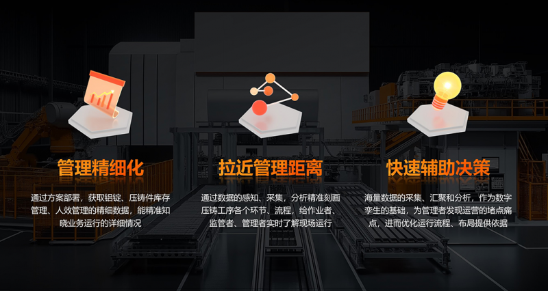 該方案把一體化壓鑄按照物料形態(tài)和工序分成三個場景,鋁錠收貨存儲及上線;壓鑄、機加、裝配工位間半成品上下料及轉運;壓鑄半成品、成品倉儲三個場景,實現(xiàn)運營精細化管理、拉進管理者距離、為優(yōu)化作業(yè)流程提供輔助決策依據(jù)。