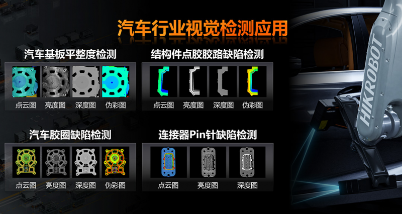 在汽車行業(yè)中,質量缺陷檢測至關重要。海康機器人擁有成熟的產(chǎn)品和解決方案,可應用于多個環(huán)節(jié),包括汽車基板平整度檢測、深度圖與點云圖的拼接,以及結構件點膠膠路缺陷檢測和連接器Pin針缺陷檢測等。