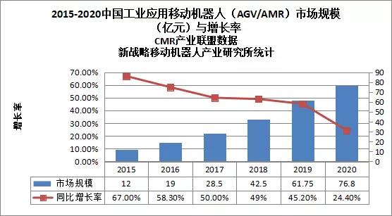 根據中國移動機器人(AGV)產業聯盟、新戰略移動機器人產業研究所的調研,2020年度中國市場新增工業應用移動機器人(AGV/AMR)41000臺,較2019年增長25.7%,市場銷售額達到76.8億元,同比增長24.4%。由此可見,2020年國內移動機器人行業盡管受到了疫情的影響,仍然保持了較好的整體增長態勢。