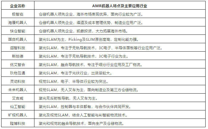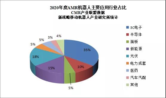 2020年AMR機器人應用主要集中在3C電子、半導體、面板、新能源及光伏、電力成套及醫(yī)藥行業(yè)等制造領域,其中3C電子行業(yè)應用規(guī)模最大,占比40%。值得注意的是,2020年AMR機器人在傳統(tǒng)的汽車市場也有滲透,但占比不大。主要原因在于新興制造業(yè)對生產線的柔性化要求程度更高,因此AMR在這些領域更受青睞。不過伴隨著AMR技術的進一步成熟以及制造業(yè)產業(yè)升級的加速,未來AMR機器人將逐漸向更廣闊的市場延伸。