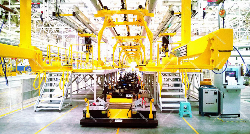 而深度定制化服務使得新松可以根據(jù)客戶需求制作千變萬化的AGV形態(tài),寧德新能源的車間還有一些體積相對較大的多軸AGV,之所以稱之為多軸,是因為它承載的設備有7組可動機構,每組可動機構之間協(xié)調工作,來移載更復雜的貨物。在這臺AGV上,除了常規(guī)的各種傳感器之外,還附帶有高精度電子秤,可以時刻反映當前貨物的重量,重心,實時調整托舉姿態(tài),防止大型貨物在移載過程中不會因為重心不穩(wěn)導致事故,這么多控制單元同時協(xié)作,在AGV上也是第一次。 新松機器人新能源行業(yè)應用涉及廣泛,除電池生產線外,新松也為新能源電動汽車打造輕量級裝載型AGV。據(jù)悉,疫情期間,新松還拿到了美國新能源汽車上海工廠近百臺總裝AGV訂單。