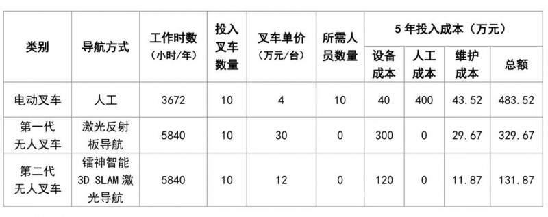上表假定了某倉(cāng)庫(kù)分別投入10輛電動(dòng)叉車、激光反射板導(dǎo)航叉車、3D SLAM激光導(dǎo)航叉車,并以5年折舊進(jìn)行投資回報(bào)對(duì)比分析。顯然,人工操作的電動(dòng)叉車投入成本最高,經(jīng)濟(jì)回報(bào)效益最低;激光反射板導(dǎo)航叉車雖然單臺(tái)叉車成本高,但在五年折舊期后總投入還是比人工的電動(dòng)叉車要節(jié)省了153.85萬元,近32%的成本;而采用鐳神智能3D SLAM激光導(dǎo)航方案的無人叉車,五年總投入成本僅131.87萬,比人工電動(dòng)叉車節(jié)省了73%的投入成本、59%的時(shí)間成本,而且五年期間倉(cāng)庫(kù)可以靈活進(jìn)行擴(kuò)建或調(diào)整,全面滿足工業(yè)互聯(lián)網(wǎng)時(shí)代下客戶終端市場(chǎng)隨時(shí)變化的需求,具有更突出的綜合效益!