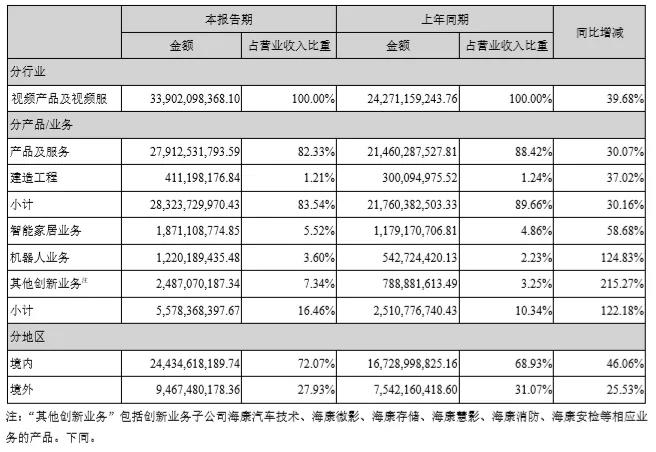 報告中主要營業(yè)收入組成如下,創(chuàng)新業(yè)務和機器人業(yè)務增長迅速,表現(xiàn)非凡。其中,海康機器人實現(xiàn)營收12.2億,同比增長124.83%。