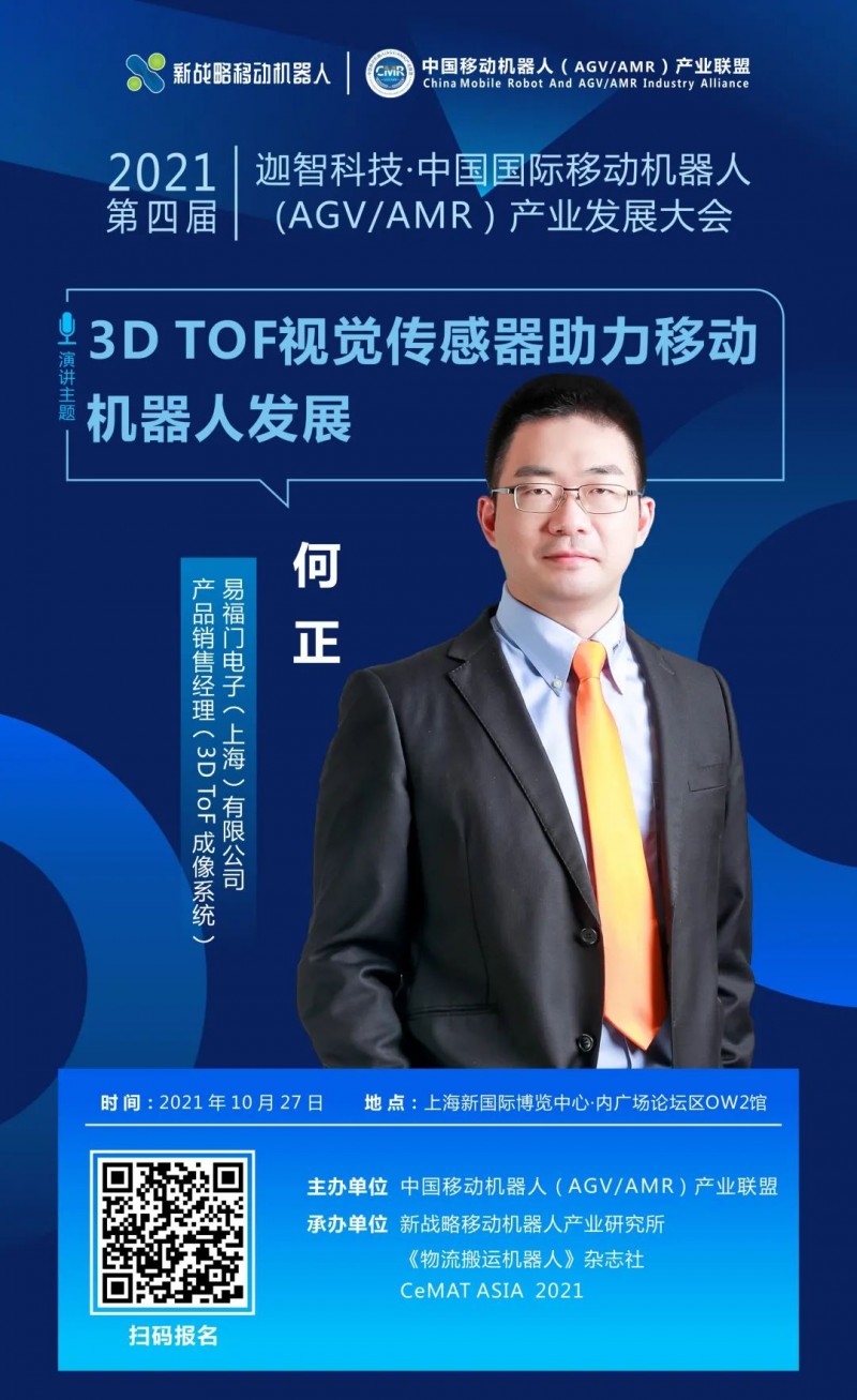 10月27日,在中國移動機(jī)器人(AGV/AMR)產(chǎn)業(yè)聯(lián)盟主辦的《第四屆國際移動機(jī)器人大會》上,易福門電子(上海)有限公司產(chǎn)品銷售經(jīng)理何正將帶來“機(jī)器人之眼:3D ToF相機(jī)帶來的無限可能”主題分享,敬請期待!