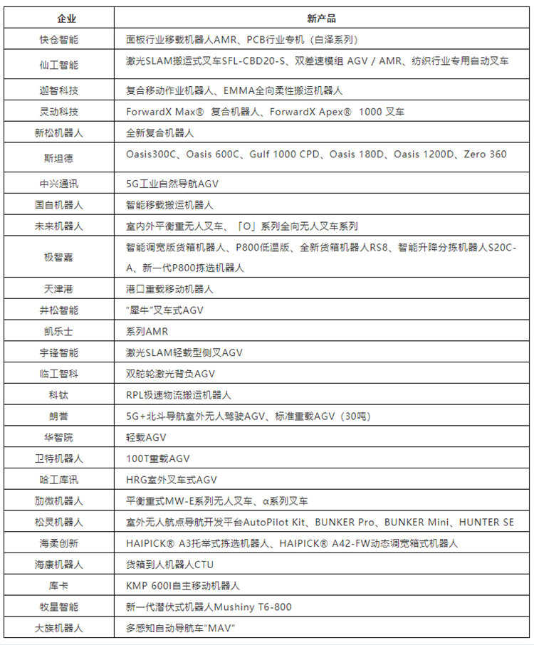 根據(jù)新戰(zhàn)略移動機器人產(chǎn)業(yè)研究所不完全統(tǒng)計,2021年,行業(yè)先后有27家企業(yè)推出了47款新產(chǎn)品,包括叉車、自然導航AGV、重載AGV、移動底盤以及各類行業(yè)專機等。