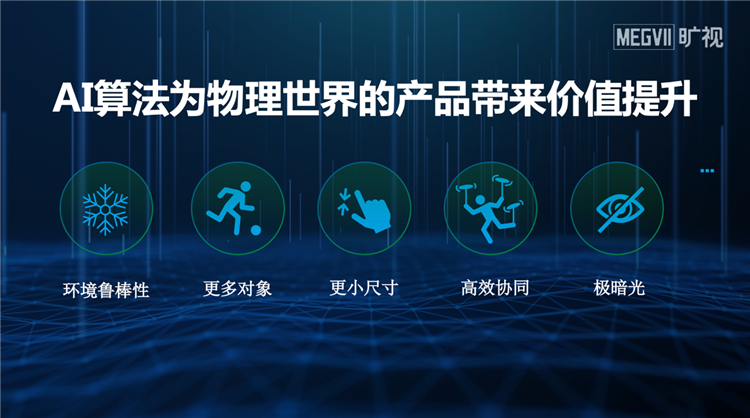 AI算法能讓設備和系統更加智能。有AI算法加持的自主移動機器人(AMR),可“腦補”缺失信息,做到不迷路,具有更強環境魯棒性。AI讓設備能處理更多對象,如曠視商品信息視覺識別系統,能同時識別紙箱上的文字、圖形、尺寸、形狀等眾多信息,甚至判斷好壞。在AI優化調度下,不同類型智能設備可實現高效協同。AI還能讓產品做到更小尺寸,應對極暗光等挑戰。
