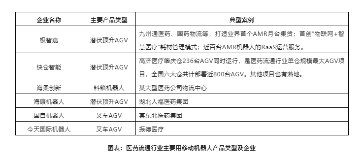 圖表:醫(yī)藥流通行業(yè)主要用移動機(jī)器人產(chǎn)品類型及企業(yè)